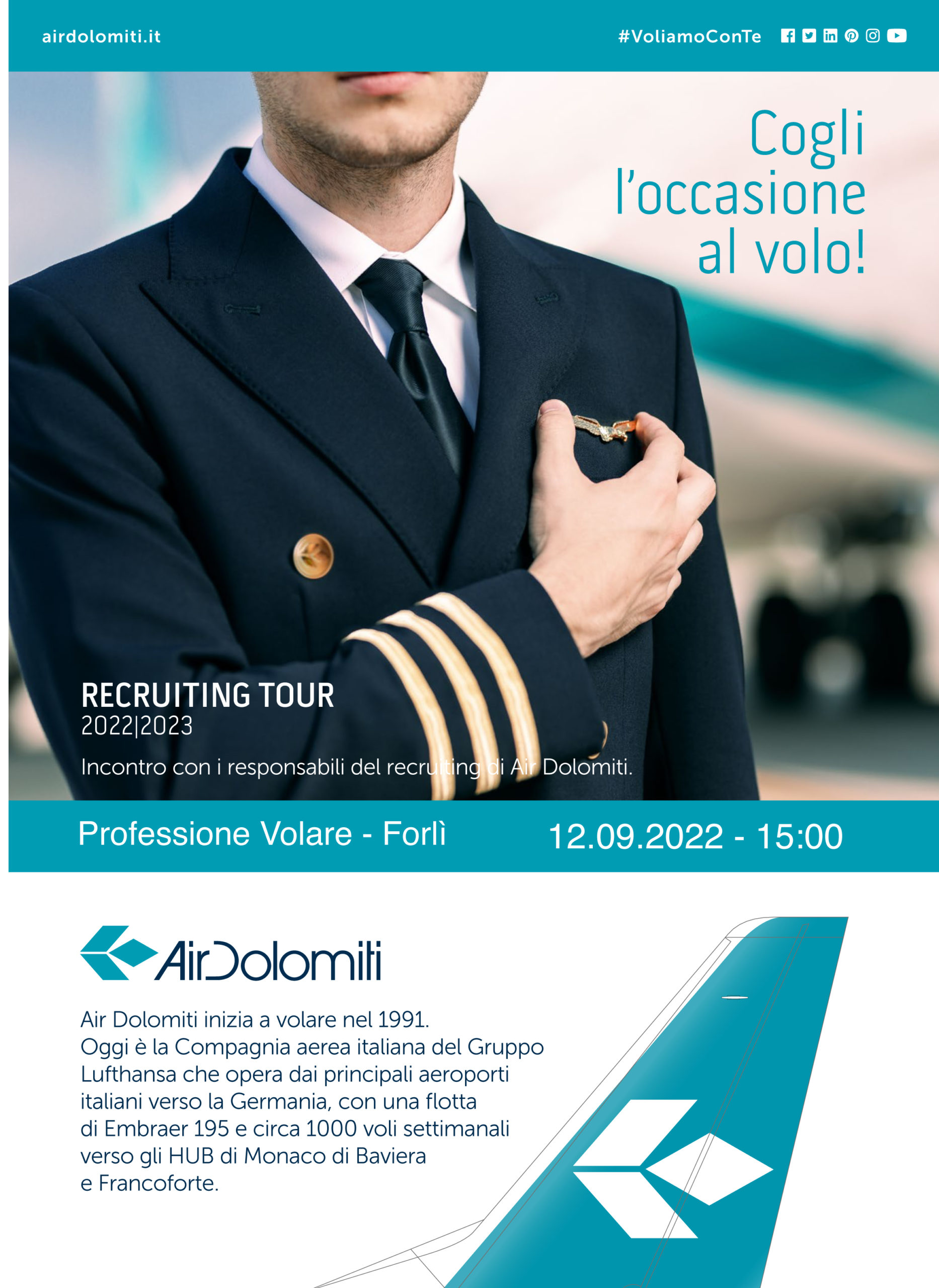 la compagnia aerea AIR DOLOMITI ha programmato per il giorno 12 SETTEMBRE 2022 una data del suo recruiting tour presso la nostra sede per poter presentare a tutti i nostri allievi ed ex allievi la Compagnia, il suo processo selettivo e le opportunità che offre ai neo assunti.